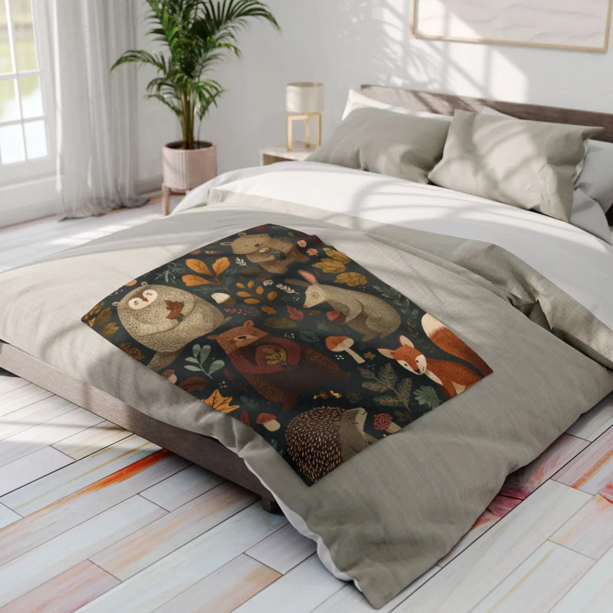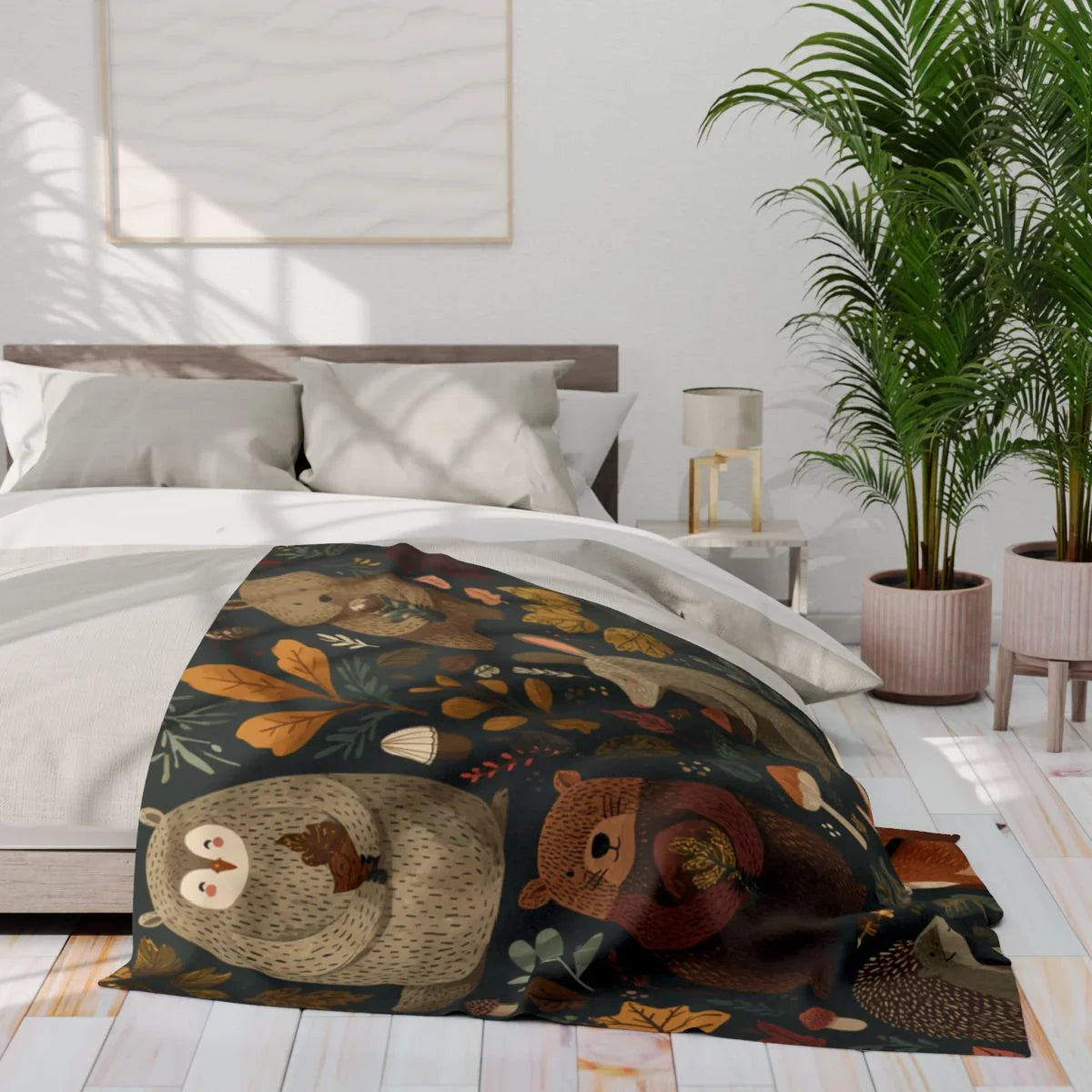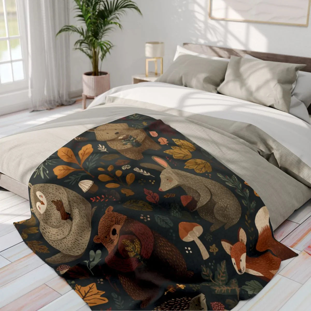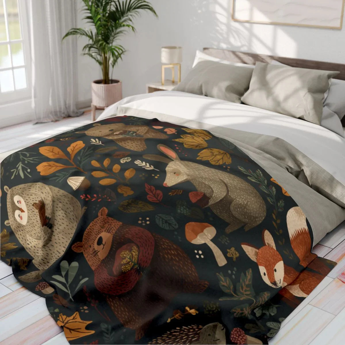This blanket features a delightful pattern of adorable animals amidst colorful foliage. The design offers a charming and cozy look.... Read more